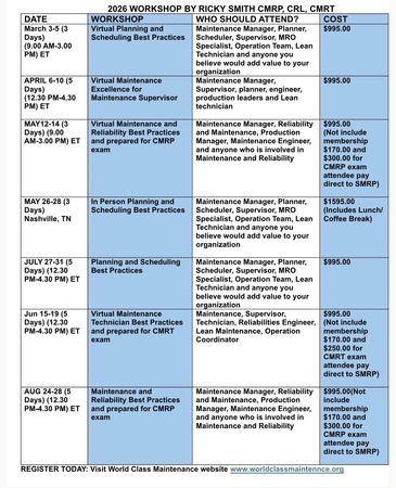 Our organization offers Maintenance and Reliability Best Practices consulting and training onsite or pubic in person or virtual Global